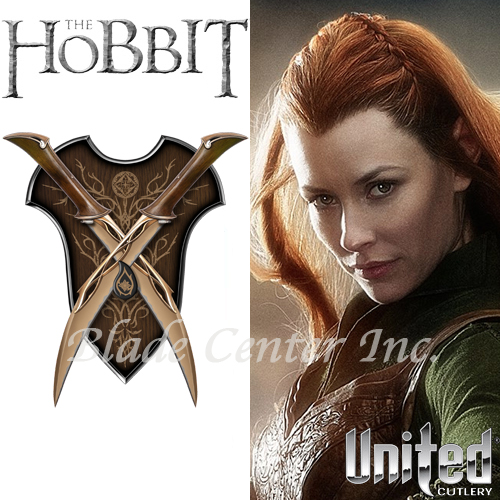 Fighting Knives of Tauriel Tauriel is a Silvan Elf and daughter of Mirkwood. Her parents were killed by orcs when she was younger and it is hinted that Thranduil looked after her since then. She is a very young elf, around the age of 600, and is insightful into the changing nature of Middle Earth, recognizing the growing evils of the world and the need to eradicate them rather than withdraw into the safety of the elven fortress. A favorite of King Thranduil and Captain of his Woodland Elven Guard, Tauriel is highly effective and lethal in combat, and primarily employs a reflex bow and two daggers in battle. She is also shown to possess medical knowledge, being able to treat wounds from poisoned weapons. As a native of the woodland realm, she is also a capable tree-climber and an adept leader. This authentically detailed replica is a reproduction of the actual filming prop built by Weta Workshop of New Zealand and used in the motion picture, THE HOBBIT: THE DESOLATION OF SMAUG. United Cutlery, industry leader in fine movie reproductions, has meticulously recreated the prop using only the finest grade materials and craftsmanship. Close attention to detail was a top priority. All officially licensed United Cutlery replicas feature the film logo and copyright notice laser engraved on the blade and are accompanied by a certificate of authenticity. The Design of the Fighting Knives of Tauriel: As Captain of the Woodland Guard, Tauriel carries signature twin daggers with blades forged of a bronzed alloy and a Silvan steel edge of superior strength. The hilts are crafted from greenwood with bronzed steel fittings. This replica is crafted of stainless steel with cast metal and polycarbonate handles, precisely detailed and colored to exactly match the movie prop. It is presented with a wood wall mount featuring graphic motif of Tauriel. Includes a certificate of authenticity. UC3044 Fighting Knives of Tauriel Includes a parchment certificate of authenticity. Overall Length: 20-1/2" Blade Length: 13-7/16" Stainless Steel Blades with Cast Metal & Polycarbonate Handles Wall Mount Display with Graphic Motif of Tauriel